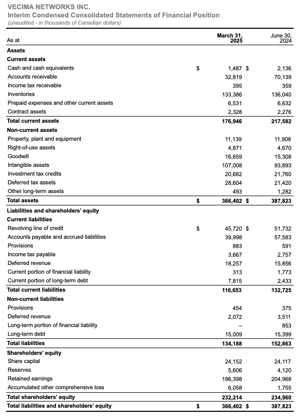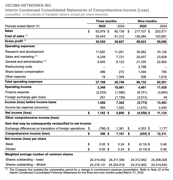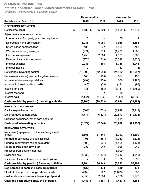 VICTORIA, BC – (May 15, 2025) – Vecima Networks Inc. (TSX: VCM) today reported financial results for the three and nine months ended March 31, 2025.