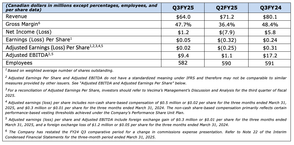 Adjusted EBITDA and Adjusted Earnings Per Share do not have a standardized meaning under IFRS and therefore may not be comparable to similar measures provided by other issuers. Accordingly, investors are cautioned that Adjusted EBITDA or Adjusted Earnings Per Share should not be construed as an alternative to net income, determined in accordance with IFRS, as an indicator of the Company’s financial performance or as a measure of its liquidity and cash flows. For a reconciliation of Adjusted EBITDA or Adjusted Earnings Per Share, investors should refer to Vecima’s Management’s Discussion and Analysis for the third quarter of fiscal 2025.